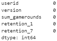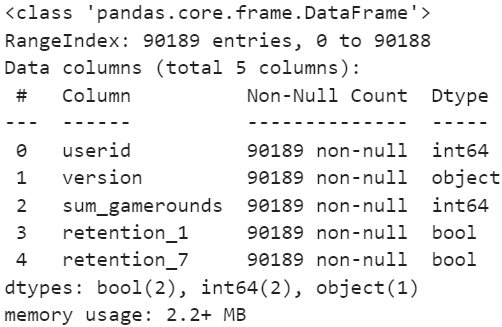 데이터 세트의 각 칼럼에 대한 기본 정보를 확인해 보니 userid 칼럼은 정수형 데이터, retention_1과 retention_7 칼럼은 논리형 데이터로 구성되어 있습니다. userid 칼럼의 데이터는 플레이어의 고유한 ID 번호이기 때문에 문자열 형식으로 변경하고 retention_1, retention_7 칼럼의 데이터는 True, False를 정수형 데이터 형식으로 변경했습니다.