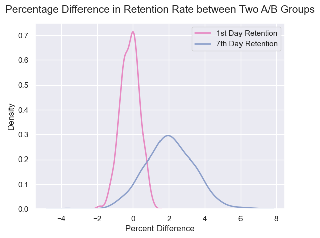 그러나 bootstrapping 방법을 통해 조금 더 심층적으로 분석한 결과 1일 차 및 7일 차의 접속률 차이를 분석한 결과 1일 차에는 두 그룹 간의 접속률 차이가 작지만 7일 차에는 gate_30의 접속률이 gate_40 접속률보다 높아진 경향을 확인했습니다.