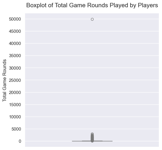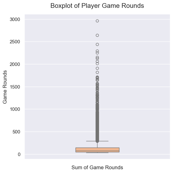 boxplot을 통해 플레이어의 총 게임 라운드 수의 분포를 확인한 결과 한 명의 플레이어가 50,000회에 가까운 매우 많은 라운드의 플레이를 했지만, 나머지 대부분의 플레이어는 5,000회도 플레이하지 못한 것을 확인할 수 있습니다.