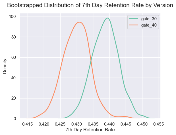 Bootstrapping 결과를 시각화해 보니 1일 차에서는 gate_40의 접속률이 gate_30의 접속률보다 더 높은 경향을 보였지만 7일 차 접속률에서는 gate_30이 gate_40보다 접속률이 높은 경향이 나타났습니다.