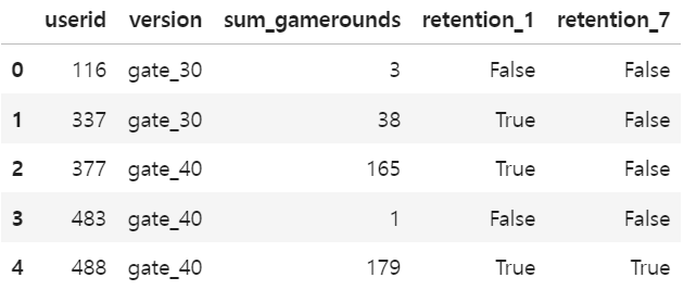 Cookie Cats A/B 테스트 데이터 세트는 90,189명 플레이어의 A/B 테스트 결과를 포함하고 있으며 플레이어 ID번호(userid), 배치된 그룹(version), 총 게임 라운드 수(sum_gamerounds), 1일 차 접속 여부(retention_1), 7일 차 접속 여부(retention_7) 총 5개의 칼럼으로 구성되어 있습니다.