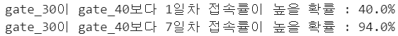 gate_30이 gate_40보다 1일 차 접속률이 높을 확률은 40%지만 7일 차 접속률이 높을 확률은 94%로 나타났습니다.